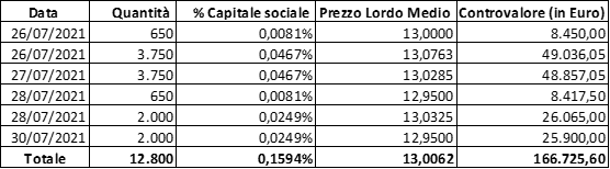 Pertanto, alla data del presente comunicato, la Società detiene direttamente n. 42.377 azioni proprie, pari al 0,5276% del capitale sociale.